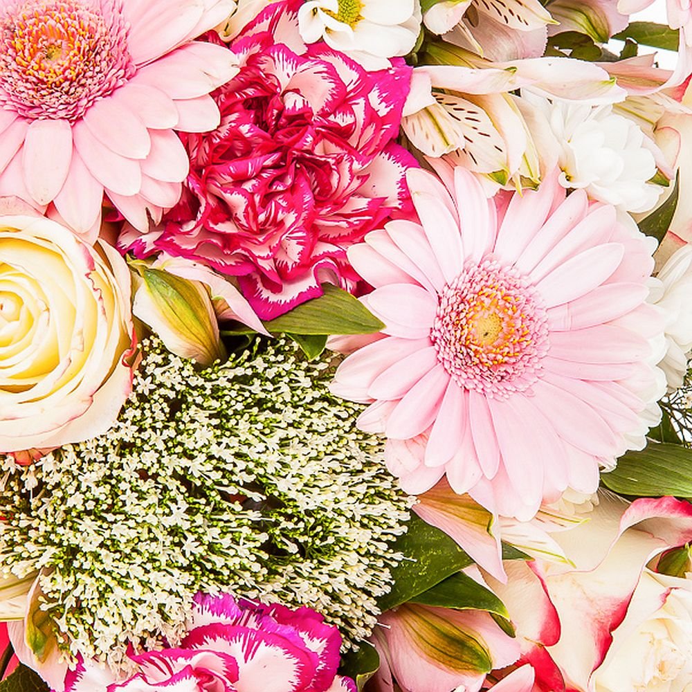 Standard Roses, Mini Gerberas, Santini Chrysanthemums, Gypsophila, Alstroemerias, Carnations & Decorative greenery (14 stems)